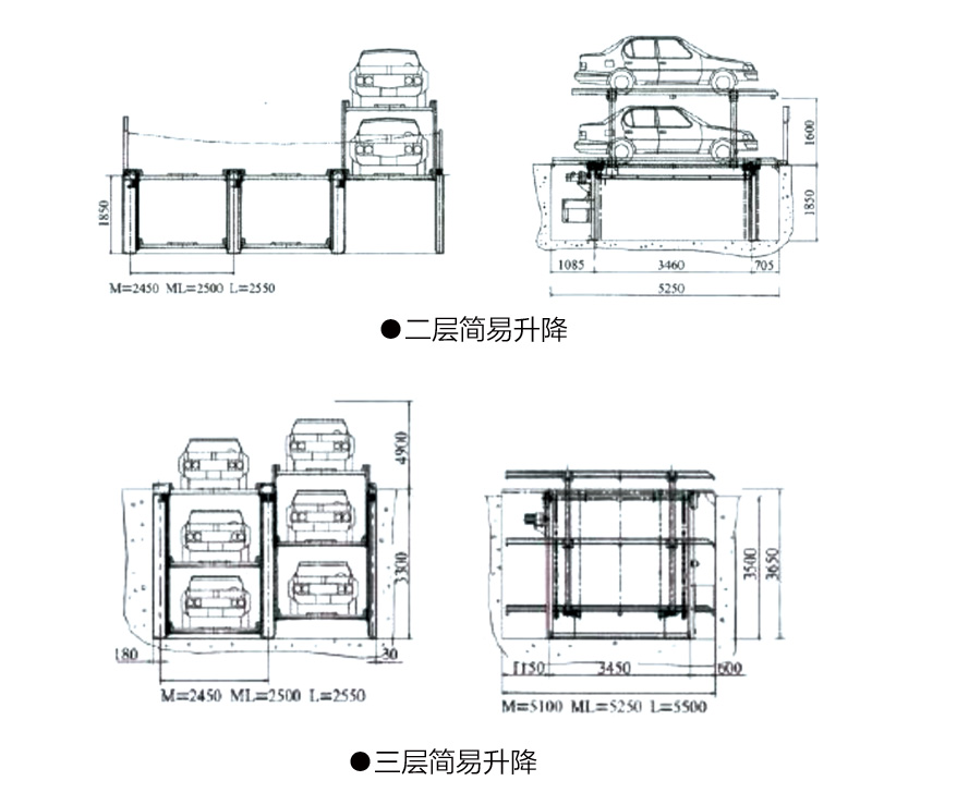 简易升降类机械式停车设备:把停车位分为上下两层 或两层以上,通过升降机构或仰俯机构将载车板提升 或下降至地面层来实现存取车,有地上二层,仰俯升 降地上二层、半地下二层和三层等。传动形式有电机 链条式、液压式。