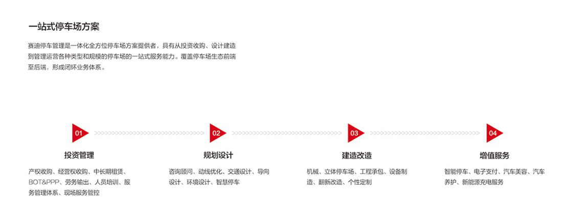 赛迪停车全面引进和吸收日本、德国和中国台湾地区自动化停车技术,并针对中国国情研发创新产品,覆盖全类型停车设备设计及生产能力,已达到了年制造加工12000个车位的生产能力。2017年全面升级转型为一站式智能立体停车服务供应商,覆盖停车设计、规划、设备生产、投资及管理的综合停车企业。
